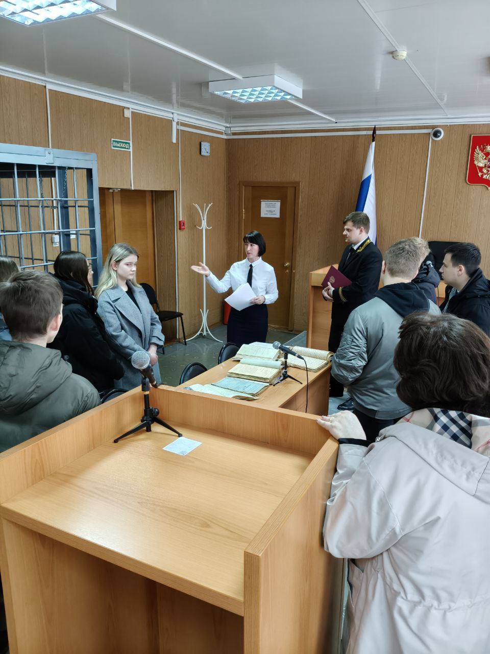 Внимание учеников было обращено на меры безопасности, осуществляемой силами судебных приставов в отношении участников судебных заседаний.